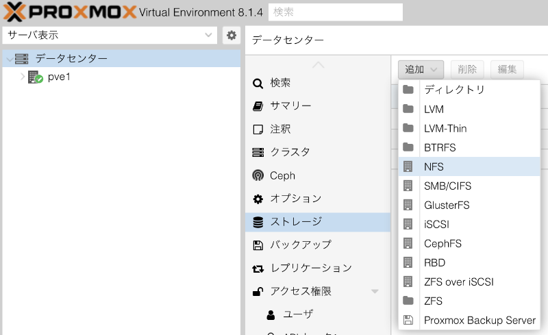これで、VMやコンテナ作成時などで、ZFSのストレージを選択することができるようになります。